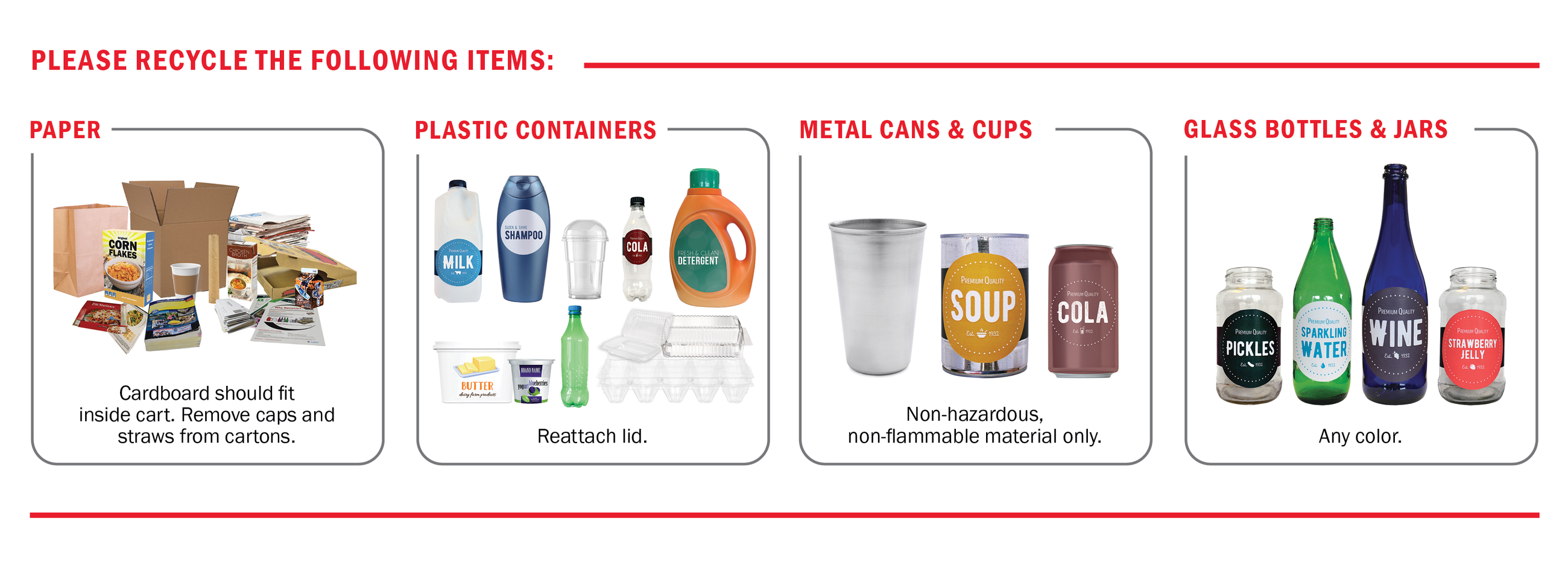BOTTLES Bottles that have a small mouth and broader base, such as soda bottles, laundry detergent bottles, water bottles, shampoo bottles, and contact solution bottles | JUGS Plastic jugs with a small mouth and wider base, such as milk jugs, water jugs, and jugs for laundry detergents and cleaning solutions. | TUBS Plastic tubs for butter, sour cream, cottage cheese, yogurt, Jell-O, and fruit slices would fall into the tub category. (Lids should be reattached before recycling.) | CUPS Fast food beverage cups, coffee cups, and Dixie cups. (This does not apply to every location; check beforehand.) | CLAMSHELL CONTAINERS STARTING NOVEMBER 1ST! Clear plastic containers used for fruit, berries, lettuce & eggs. |